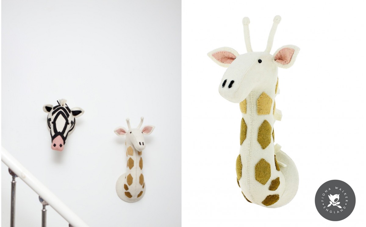 Hechos a mano usando métodos tradicionales y artesanales, estos trofeos cabezas de animales de peluche por Fiona Walker Inglaterra son ideales para decorar la pared de un dormitorio infantil.