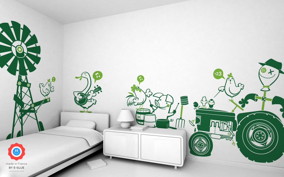 Estos únicos diseños, con formas simples, han sido desarrollados por un trabajo de las líneas, las curvas y los contornos para dar volumen manteniendo un aspecto decorativo, no recargar visualmente el espacio, facilitar la instalación y utilizar únicamente un proceso de corte sin impresión para fabricar los vinilos. Sin materiales con disolvente o tinta, E-Glue garantiza un ambiente sano y seguro para los niños.