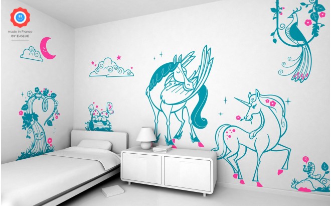 Ces stickers sont parfaits pour transformer facilement les murs de la chambre de votre fille en un monde féérique et fantastique. En kit complet, ces originaux stickers enfants illustrent la rencontre romantique de Pégase et d’une autre licorne, pour un coup de foudre décoratif ! Tous ces stickers muraux ne sont qu’amour, grâce et harmonie sur fond de nuit étoilée. Ils ravissent les petites filles ayant également un coup de coeur pour les chevaux.