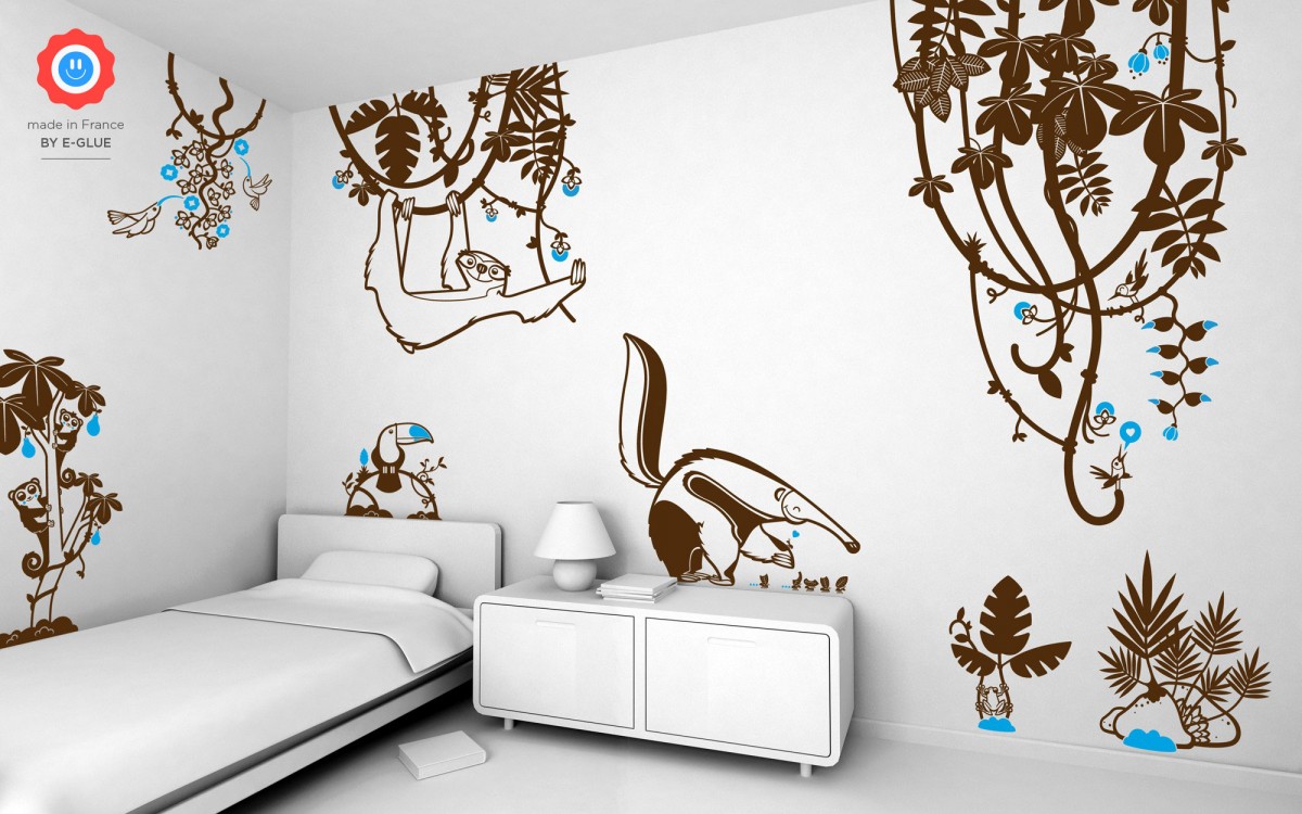 Ces dessins uniques, aux formes simples, ont été créés par un travail spécifique des lignes, des courbes et des contours pour rendre certains volumes tout en gardant un aspect décoratif, ne pas alourdir l'espace, faciliter la pose, utiliser uniquement une technique de découpe pour la fabrication et ainsi ne pas avoir recours à de l’impression. Sans solvant, ni encre ou autre produit chimique appliqué à la surface de ses stickers muraux, E-Glue garantit un environnement sain et sécurisé aux enfants.
